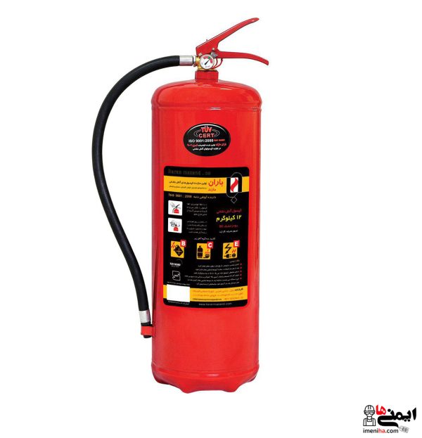 کپسول پودر گاز باران 12 کیلویی همراه با نازل شلنگی ساخت شرکت معتبر باران مازند و دارای گواهینامه بین المللی 2008 : 9001 ISO و مناسب مکان هایی چون پمپ بنزین و منازل و ادارات و کارخانجات و صنایع چاپ و بسته بندی ، انبار کاغذ و مقوا ، صنایع نساجی و پارچه بافی، صنایع چوب و نجاری و …