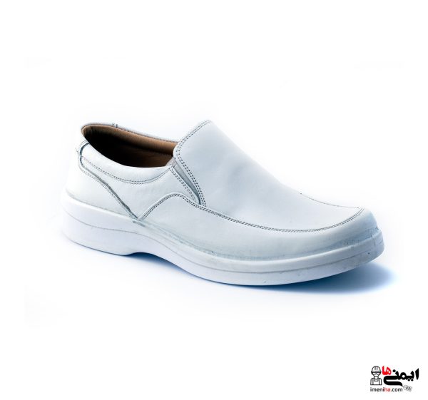 کفش کار اداری پای آرا مدل آرین با رنگ سفید دارای زیره PU و رویه شبرو طبیعی موجود در سایزهای 40 تا 45 با وزن سبک و آستر چرم و کفی طبی