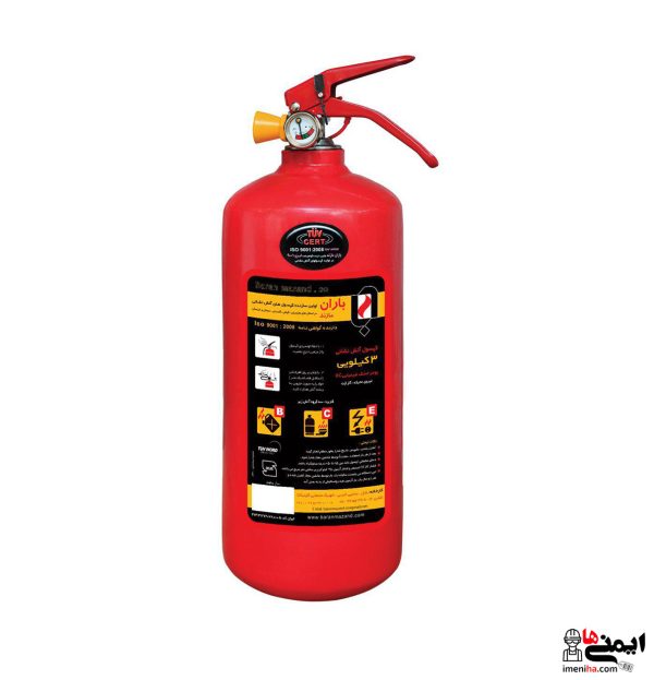 خاموش کننده پودری باران 3 کیلویی ساخت شرکت معتبر باران مازند و دارای گواهینامه بین المللی 2008 : 9001 ISO و مناسب مکان هایی چون پمپ بنزین و منازل و ادارات و کارخانجات و صنایع چاپ و بسته بندی ، انبار کاغذ و مقوا ، صنایع نساجی و پارچه بافی، صنایع چوب و نجاری و …